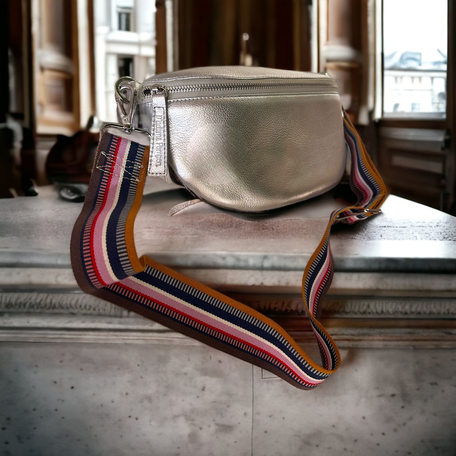 Medidas: - Alto: 14 cm - Ancho: 25 cm - Cubierta: 7 cm - Correa de algodón orgánico: 115 cm regulable