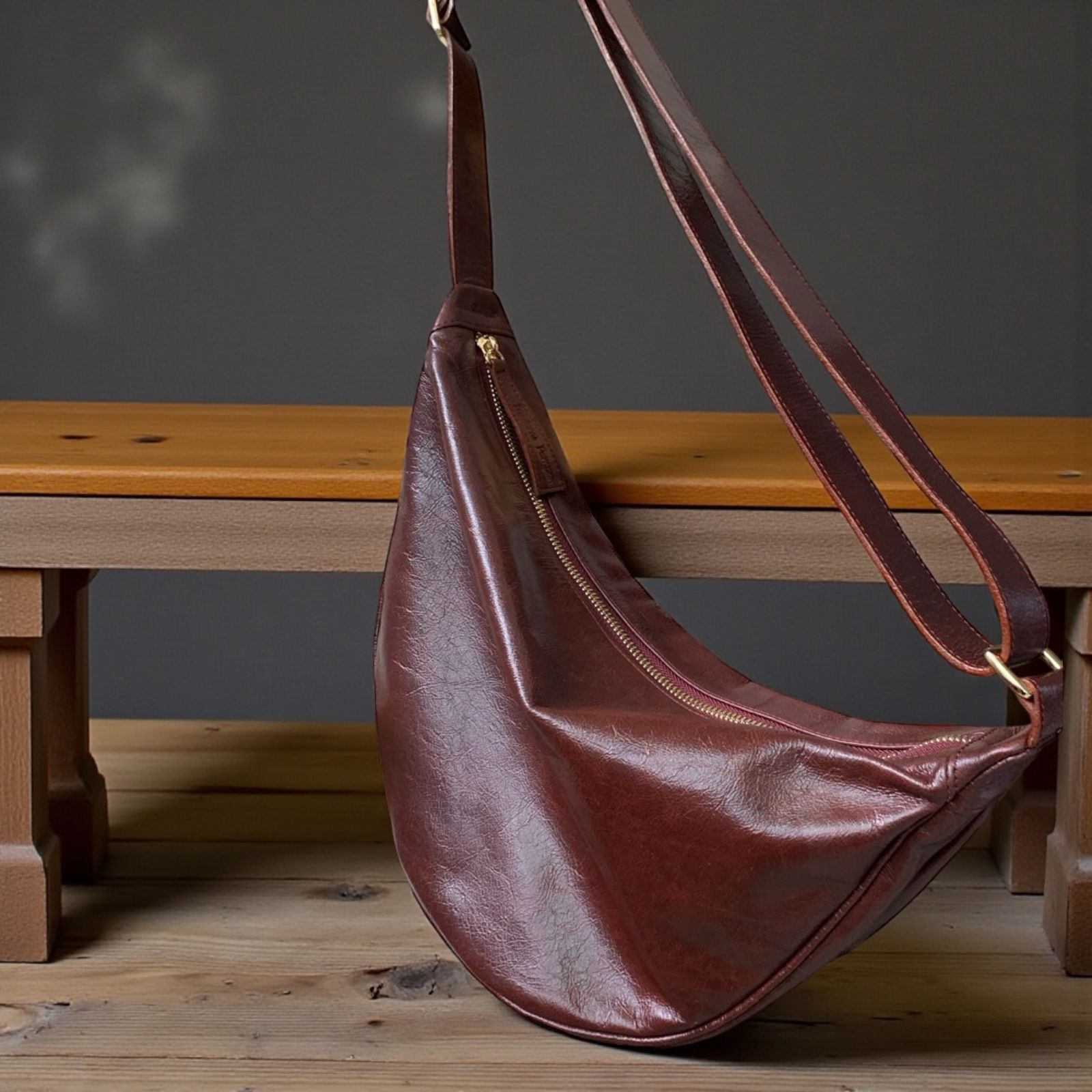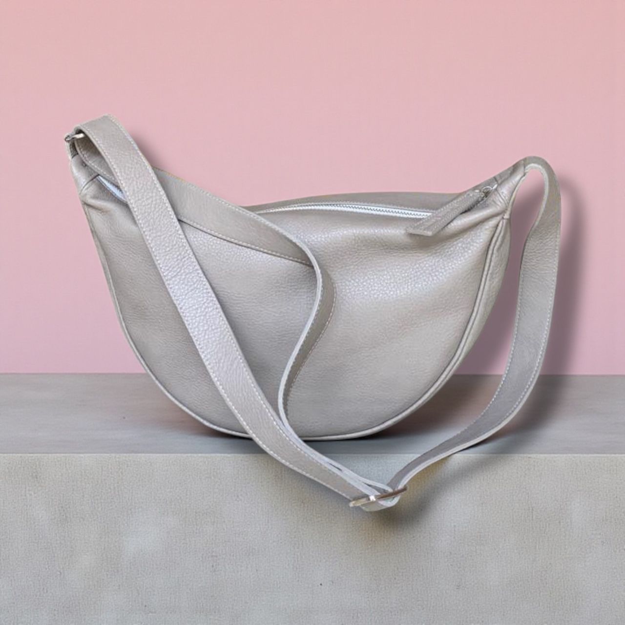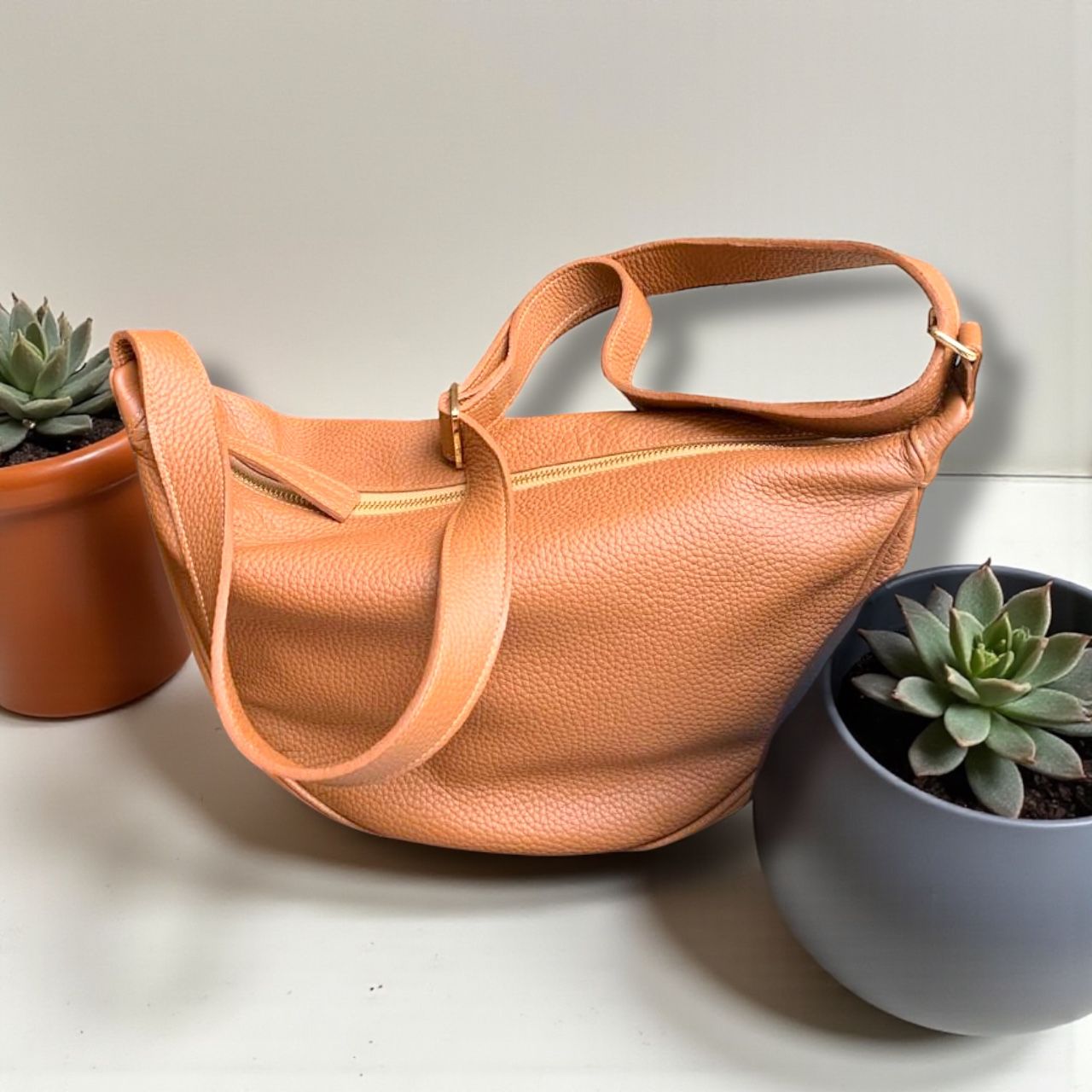 Medidas: - Alto: 23 cm - Ancho: 35 cm - Base: 12 cm - Asa de cuero: 120 cm regulable